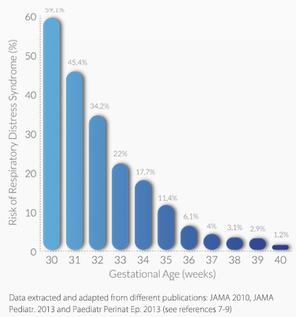For that reason, reference associations like ACOG recommend that obstetricians confirm fetal pulmonary maturity prior to elective delivery with less than 39 weeks gestation. That information, directly related with the risk of Neonatal Respiratory Morbidity, is advisable in order to plan place and time of delivery together with the neonatologists.